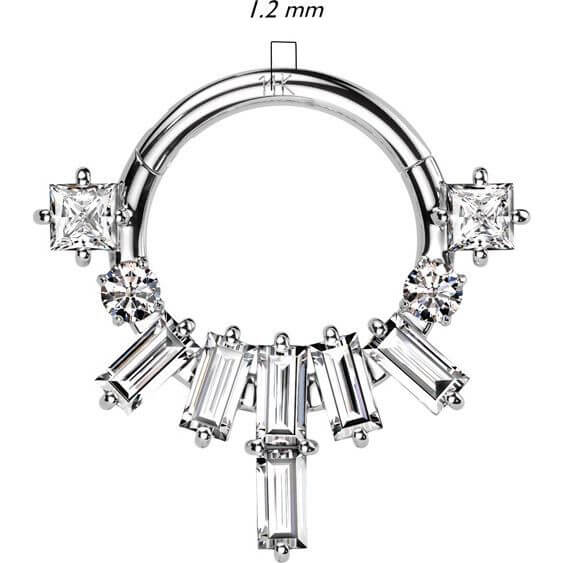 Oro 14 kt Anello Piercing Ventaglio di Zirconi taglio Baguette Clicker